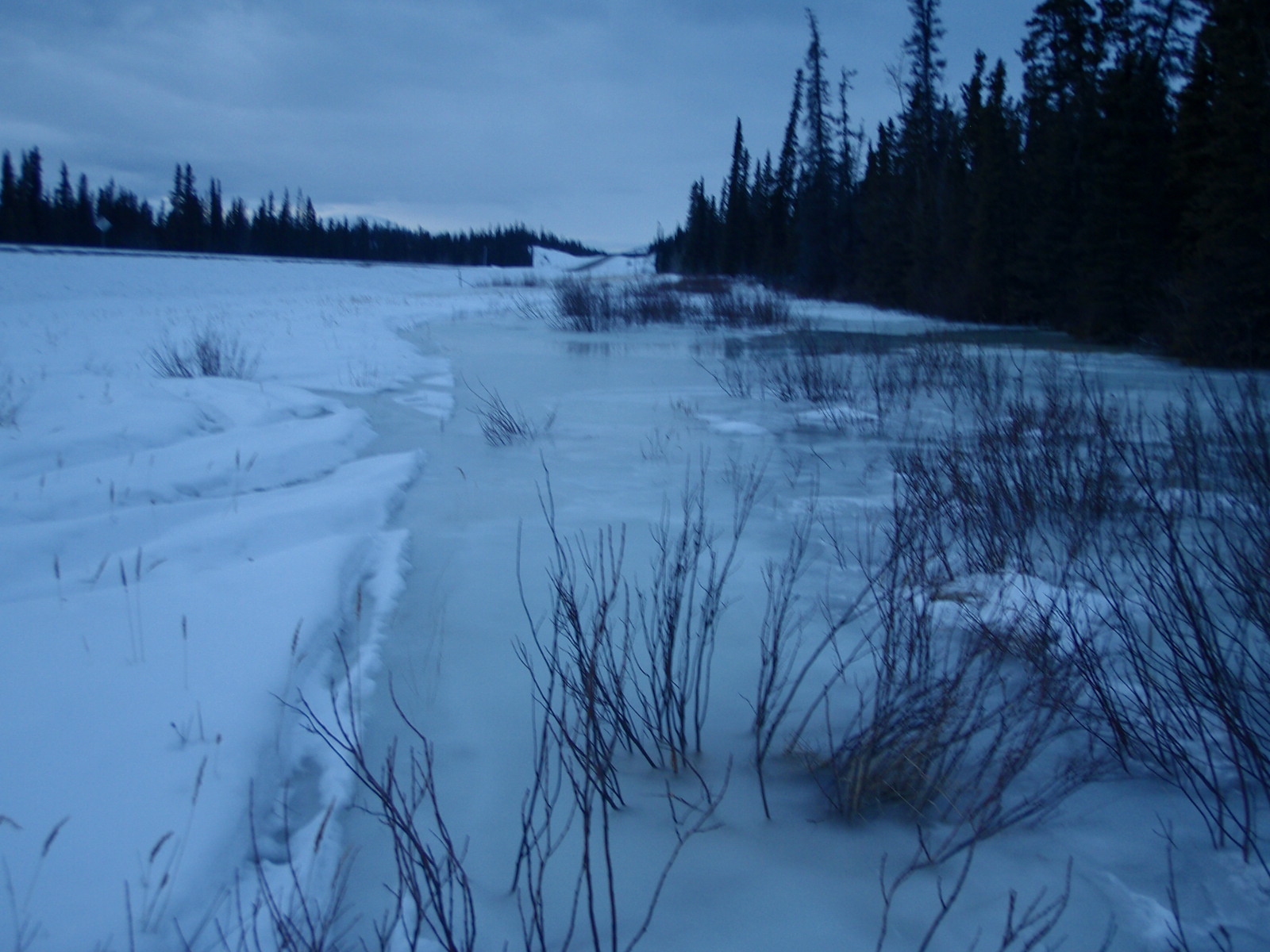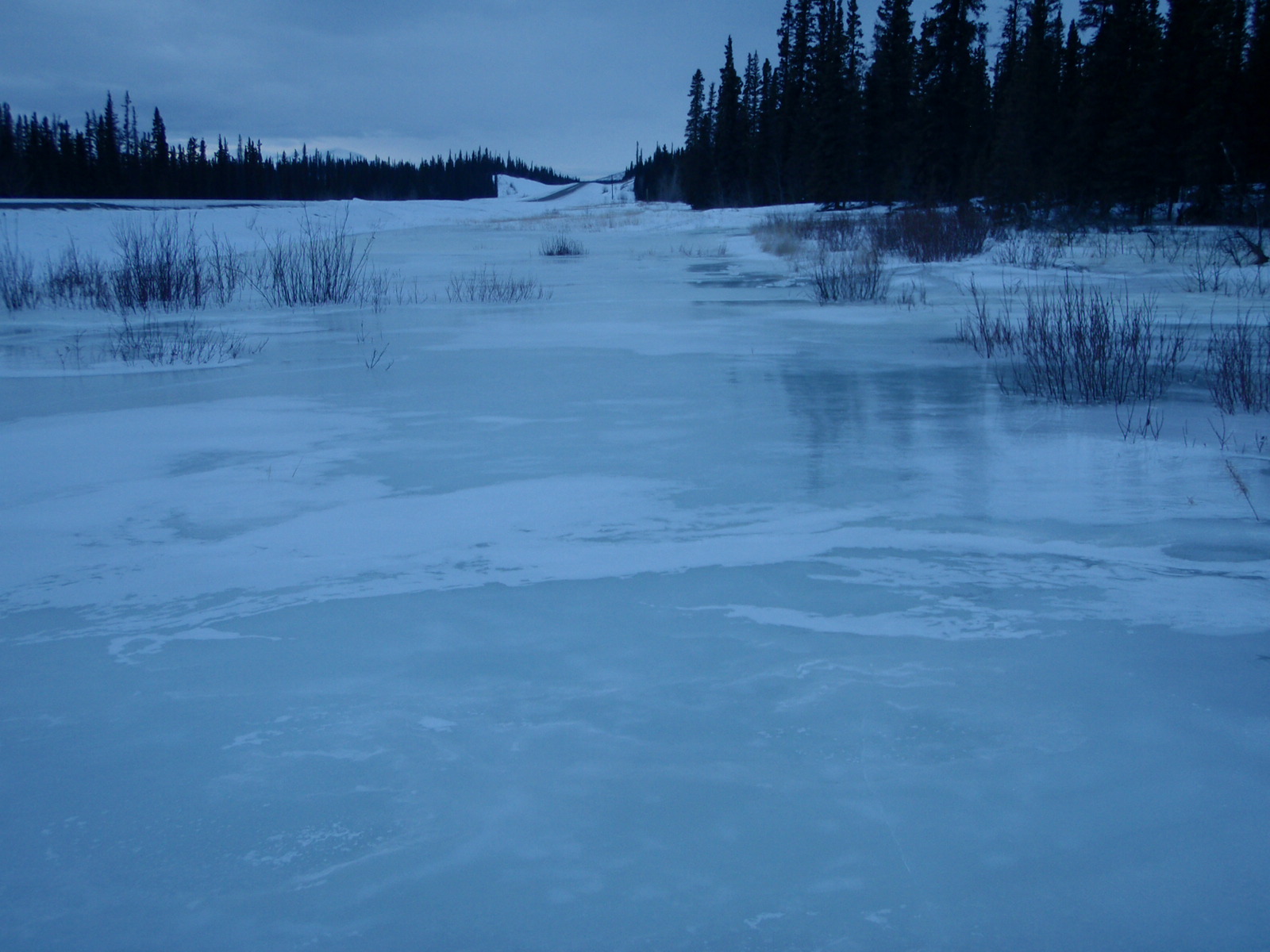 The overflow is a bit nasty. This area is about 17km out of Mendenhall, towards Haines Junction. It’s not too long, not much more than a km of overflow, but it’s also sporadic broken up with some snow. These are the worst areas.