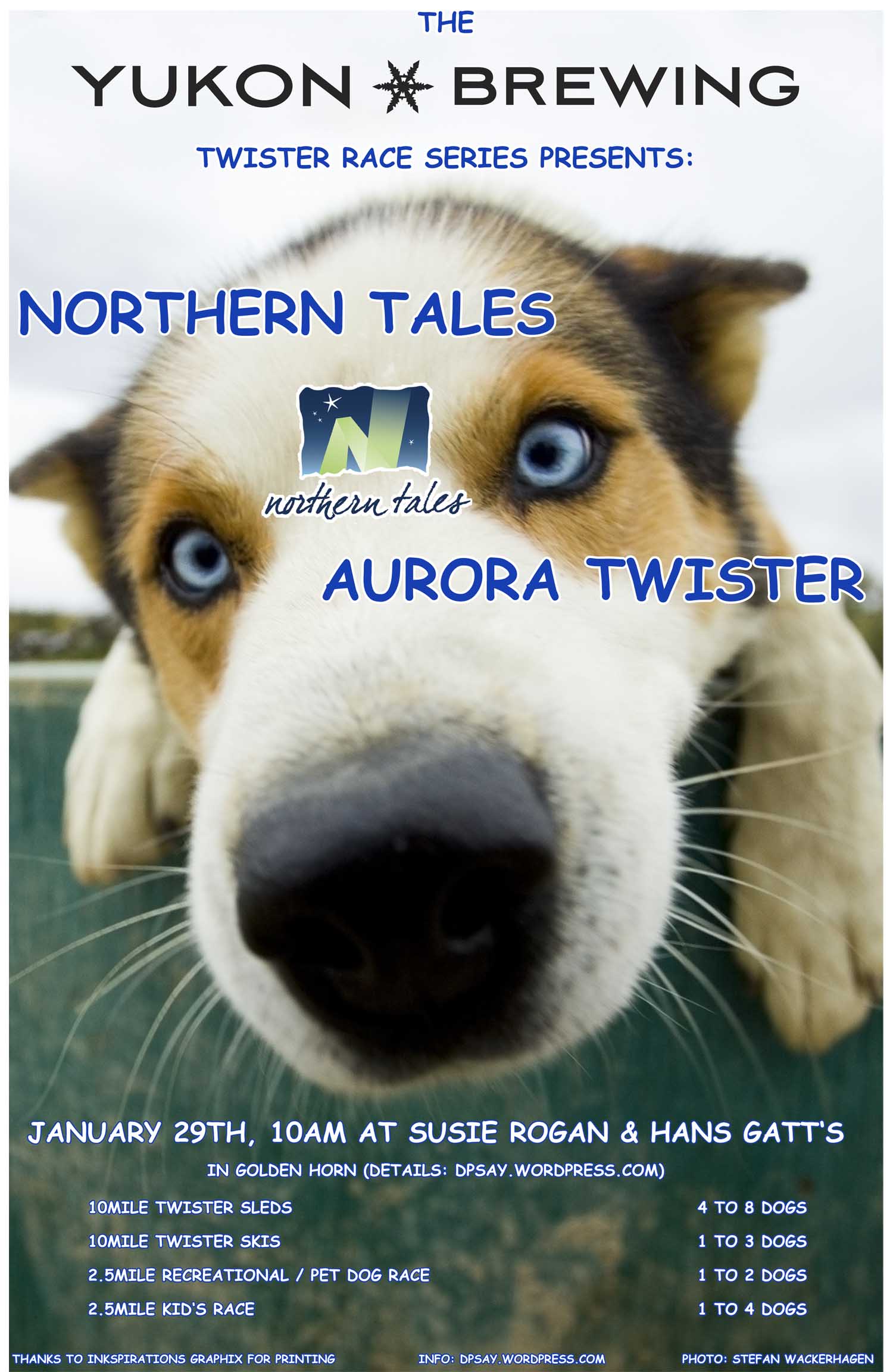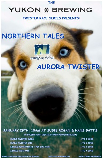 The next Twister Dog Sled and Skijor Race will be held on January 29th, 2012 at Susie Rogan & Hans Gatt’s place in the Golden Horn area south of Whitehorse.