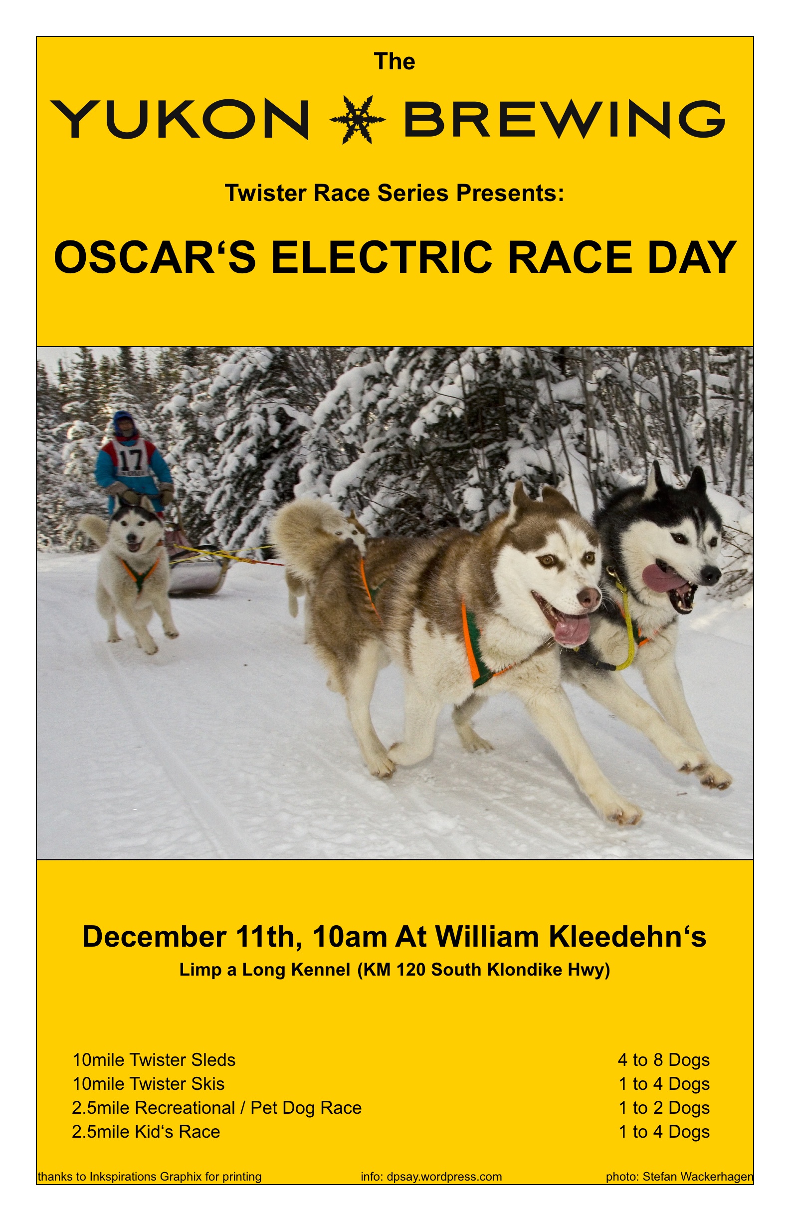 The organizers of “Oscars Electric Race Day” in DPSAY’s “Yukon Brewing Twister Race Series” where more than happy with last Sundays turn-out. Ten mushers competed in the sled category and eight skijorer harnessed their dogs to run the race at William Kleedehns “Limp a long kennel” near Carcross. It was the first time for the Yukon Quest veteran to host a race at his home location. Gaetan Pierrard and Pierre Duc helped him to prepare a great 10 mile trail. Maren Bradley volunteered to be the Race Marshal and Mike Simon was responsible for the timing.